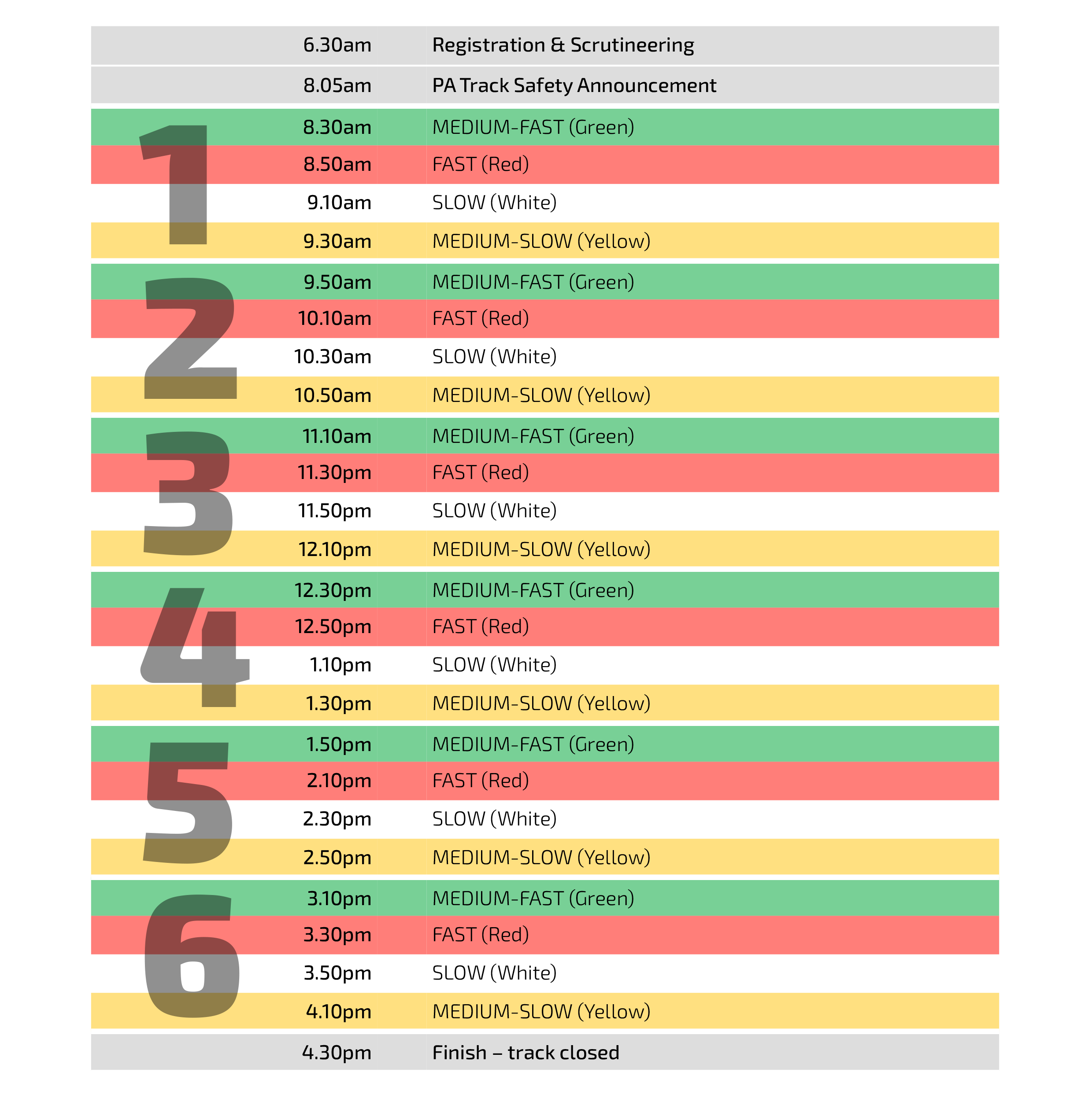 Each group is allocated 6 x 20 minute riding sessions, a typical schedule of which can be found below. This schedule can be impacted by stoppages due to on-track incidents, so be sure to keep an ear out for PA announcements and / or check with registrations staff.
